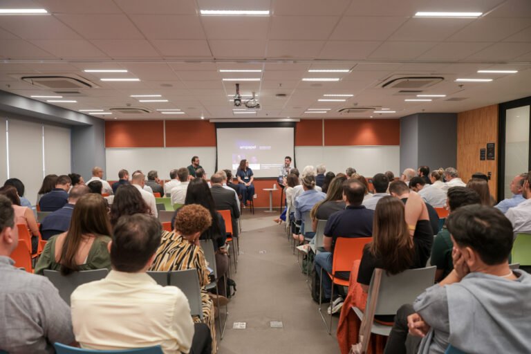 Na manhã do dia 10 de março, cerca de 60 representantes do setor de embalagens de papel estiveram presencialmente reunidos no Cubo Itaú, em São